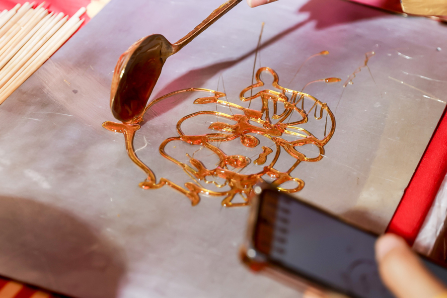 新年限定体验区,配资门户网特邀书法家根据每个人喜欢的作品和角色写下专属春联。来自吉林省吉林市的市级非遗糖画代表性传承人田佳瑞则一边展示传统糖画作品,一边接受大家各式各样的定制要求,娴熟地制作各种动漫游戏角色糖画。有人举着定制的“罗小黑”糖画兴奋地拍照,“非遗传承人手一晃,三两下就画出可爱的小黑猫,太牛了!这糖甜到心里了!”