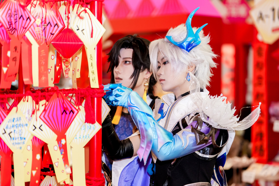 游戏区,有人玩套圈、猜灯谜赢限定周边,拓印“和亲友永远在一起”“抽卡必出金”等二次元新年祝福。