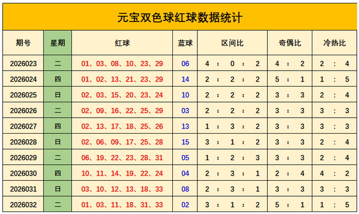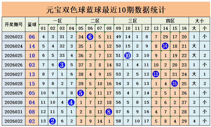 上期回归:双色球第2026032期开出奖号:红球01、03、11、18、31、33;蓝球02,其中红球三区比为3:1:2,奇偶比5:1,蓝球开出小偶数号码02。