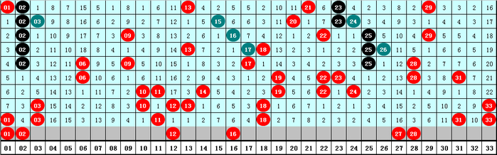 2、凤尾分析:最近十期凤尾号码散布在24-33区间,走势相比汇注,凤尾012路为4:2:4,1路奖号走冷,本期关心1路凤尾号码,参考28。
