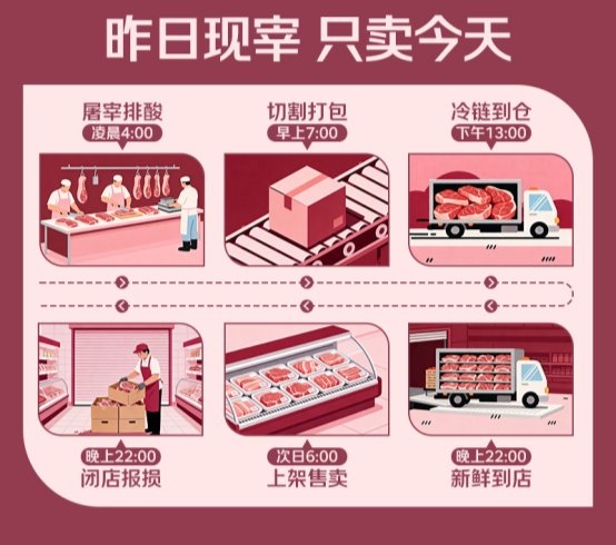 耐久以来,市面生鲜肉品从宰杀加工到最终上架,短少明确的时效不息,敞开周期频频长达三天以上,肉质口感与养分价值均难以保险。京东七鲜超市这次推出的“24小时肉”,不仅栽植“24小时产地到店”的鲜度标杆,更针对不同品类特点设定了各异化、更细节的“24小时”旅途——猪肉品类终了“24小时加工分装到店,只卖一天”;牛肉品类更终了“24小时宰杀加工到店,只卖一天”。