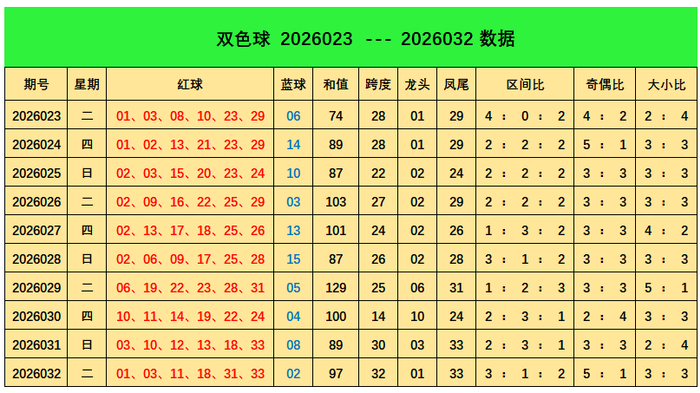 上期归来:双色球第2026032期开出奖号:红球01、03、11、18、31、33;蓝球02,其中红球三区比为3:1:2,奇偶比5:1,大小比为3:3,蓝球开出2路号码02。