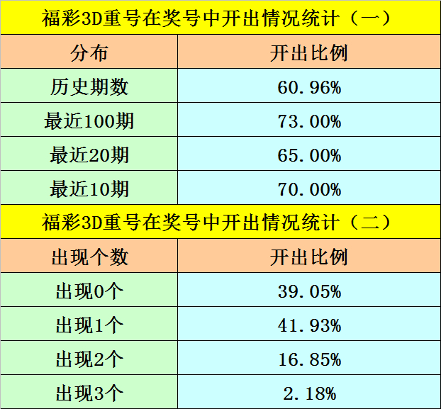 最近100期开奖中,含有重号的奖号有73期,最近20期含有重号的奖号有13期,最近10期含有重号的奖号有7期。本期排斥重号。