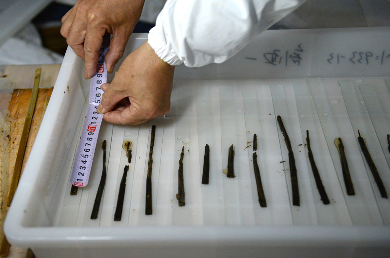 2015年11月24日,考古文保东谈主员在位于江西南昌的海昏侯墓工作文保用房内对出土的竹简进行剥离(尊府相片)。 新华社记者 万象 摄
