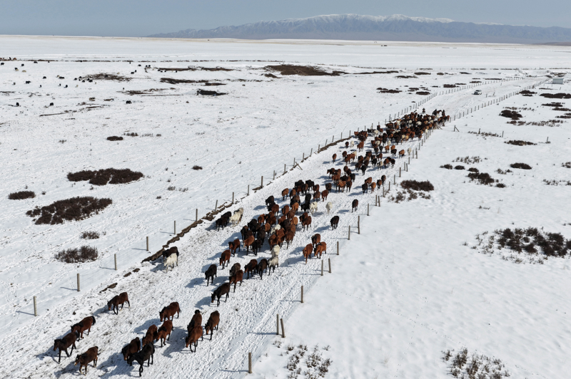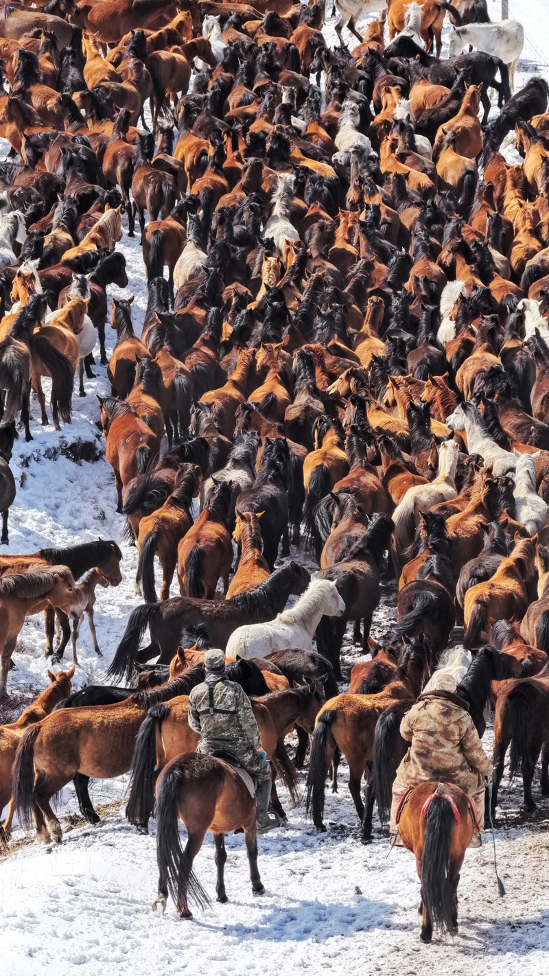 4月14日,山丹马场的牧马东谈主组织马群转场(无东谈主机相片)。 新华社发(王超摄)