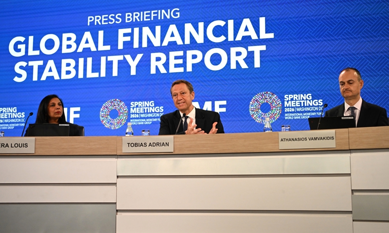 4月14日,在好意思国华盛顿,外舶来品币基金组织(IMF)货币与成本市集部主任托比亚斯·阿德里安(中)在《全球金融踏实证实》新闻发布会上谈话。 新华社记者 李睿 摄