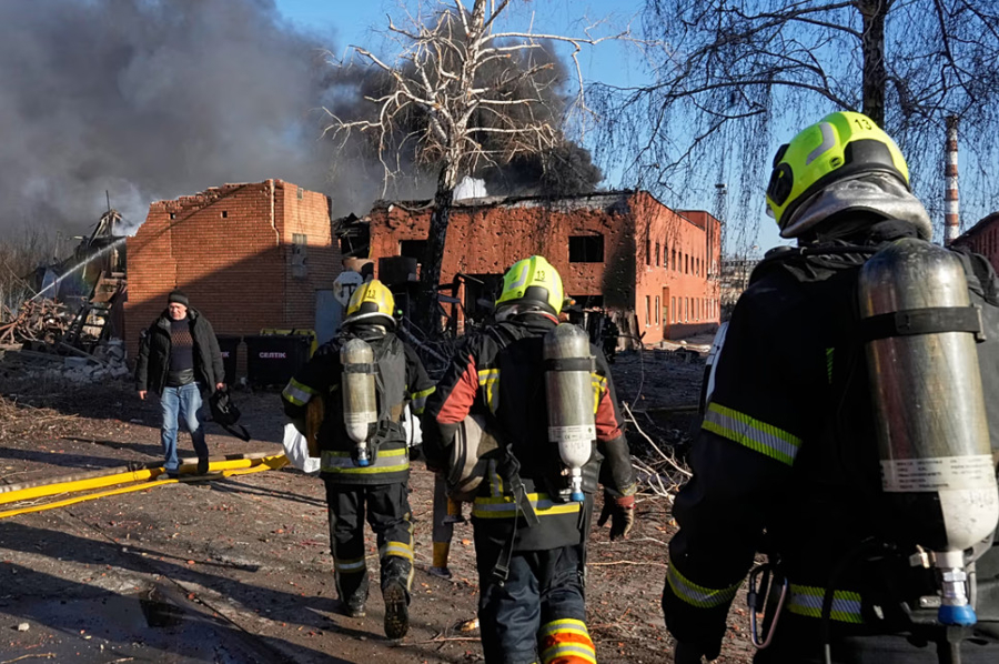 3月14日,消防员赶往乌克兰布罗瓦雷一个遭袭受损的铁路车间。图源:GJ